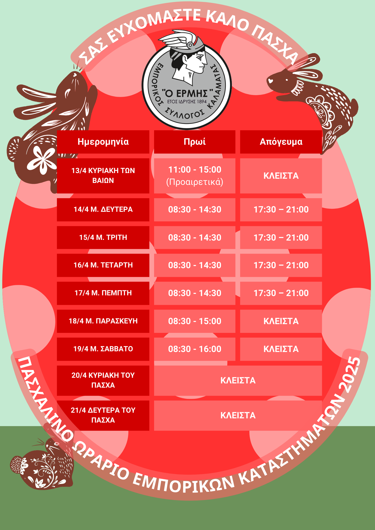 Σας παραθέτουμε το προτεινόμενο εορταστικό ωράριο των καταστημάτων για την Περίοδο του Πάσχα 2025.