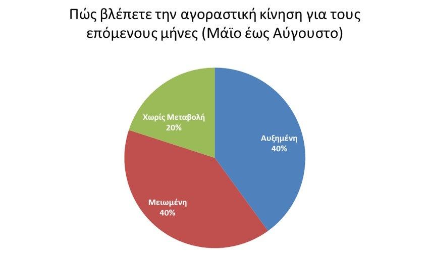 Στο ερώτημα πως προβλέπουν ότι θα είναι η αγοραστική κίνηση τους επόμενους μήνες του καλοκαιριού (Μάιο - Αύγουστο) το 40% θεωρεί ότι θα αυξηθεί λόγω εποχής, ενώ αντίθετα το 40% προβλέπει ότι θα είναι μειωμένη λόγω ακρίβειας και εκλογών. Το 20% των επιχειρήσεων θεωρεί ότι δεν θα υπάρξει σημαντική μεταβολή στην αγοραστική κίνηση και θα παραμείνει περίπου στα ίδια επίπεδα.