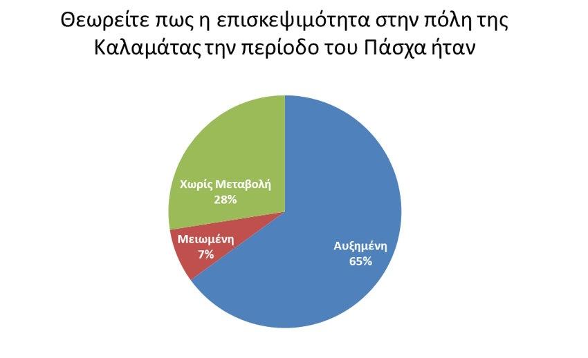 Στο ερώτημα σχετικά με το πως είδαν οι επιχειρήσεις την επισκεψιμότητα στην πόλη της Καλαμάτας από άλλες περιοχές την περίοδο του Πάσχα το 65% απάντησε ότι είδε αύξηση, με το 27,5% να απαντά ότι δεν είδε σημαντική μεταβολή και μόλις το 7,5% να βλέπει μείωση σε σχέση με το 2022.