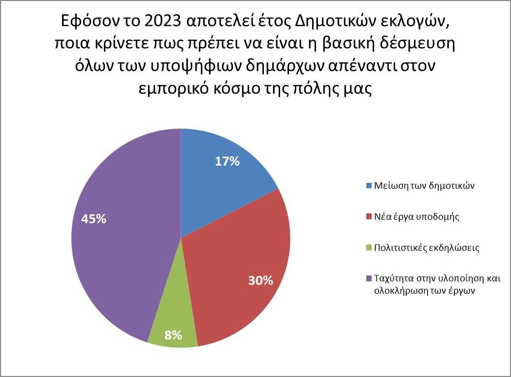 Στο τελευταίο ερώτημα της δημοσκόπησης "Εφόσον το 2023 αποτελεί έτος Δημοτικών εκλογών, ποια κρίνετε πως πρέπει να είναι η βασική δέσμευση όλων των υποψήφιων δημάρχων απέναντι στον εμπορικό κόσμο της πόλης μας" το 45% των επιχειρήσεων ζητά από την δημοτική αρχή "Ταχύτητα στην υλοποίηση και ολοκλήρωση των έργων στην πόλη μας" ενώ σε ποσοστό 30% ο εμπορικός κόσμος θεωρεί ότι χρειάζονται "Νέα έργα υποδομής που διευκολύνουν την πρόσβαση στα εμπορικά σημεία της πόλης πχ Θέσεις στάθμευσης, πεζοδρομήσεις κτλ". Το 17,5% ζητά 'Μείωση των δημοτικών τελών προς τις επιχειρήσεις" και το 7,5% "Πολιτιστικές εκδηλώσεις με στόχο την αύξηση της επισκεψιμότητας ανά περιόδους".