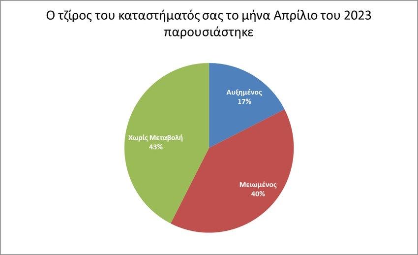 Στο ερώτημα πως ήταν ο κύκλος εργασιών (τζίρος) στις επιχειρήσεις της Καλαμάτας την περίοδο του Απριλίου σε σχέση με την αντίστοιχη του 2022 το 17,5% των ερωτηθέντων απάντησε ότι ήταν αυξημένη ενώ περίπου το 40% είδε μείωση στον τζίρο του. Το 42,5% είδε τον τζίρο της επιχείρησης του να μην έχει σημαντική αλλαγή σε σχέση με το 2022.