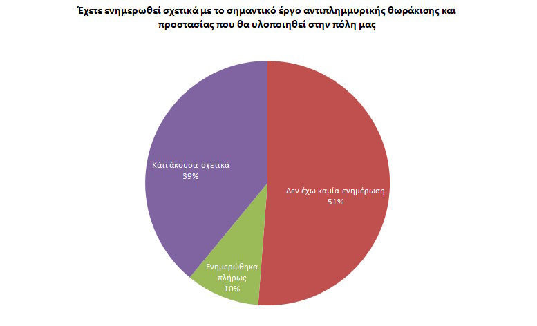 Στο ερώτημα κατά πόσο οι συνάδελφοι έχουν ενημερωθεί σχετικά με το σημαντικό έργο αντιπλημμυρικής θωράκισης και προστασίας που θα υλοποιηθεί στην πόλη μας καθώς και για τις αλλαγές και τις ανακατατάξεις που αυτό θα επιφέρει, το 51,21% απάντησε ότι δεν έχει καμία ενημέρωση, το 9,75% ότι έχει ενημερωθεί πλήρως και το 39,02% ότι έχει ακούσει κάποια πράγματα σχετικά με το έργο.