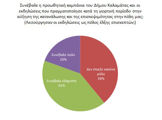 Στο τελευταίο ερώτημα για το πώς κρίνουν τις ενέργειες και τις εκδηλώσεις που πραγματοποιήθηκαν από τον εμπορικό σύλλογο Καλαμάτας (όπως Διαγωνισμός βιτρίνας, app κλήρωσης αποδείξεων, επισκέψεις Αγ Βασίλη κτλ) το 56,09% θεωρεί ότι Συνέβαλαν στη δημιουργία γιορτινού κλίματος αλλά δεν μεταφράστηκε σε κατανάλωση, το 24,39% απάντησε ότι συνέβαλε στην αύξηση επισκεψιμότητας στην αγορά και στην αύξηση της κατανάλωσης ενώ το 19,51% θεωρεί ότι Δεν συνέβαλαν ούτε στην δημιουργία γιορτινού κλίματος ούτε στην αύξηση της κατανάλωσης.