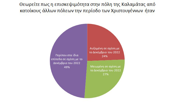 Στο ερώτημα για πως θεωρούν οι επαγγελματίες ότι ήταν η επισκεψιμότητα στην πόλη της Καλαμάτας από κατοίκους άλλων πόλεων την περίοδο των Χριστουγέννων το 24,39% (40,43% το 2022) υποστηρίζει ότι ήταν αυξημένη σε σχέση με 26,82% ( 27,66% το 2022) που είδε μειωμένη κίνηση επισκεπτών από άλλες πόλεις. Τέλος το 48,78% ( 31,91% το 2022) υποστηρίζει ότι δεν υπήρξε μεταβολή στην επισκεψιμότητα της πόλης της Καλαμάτας.