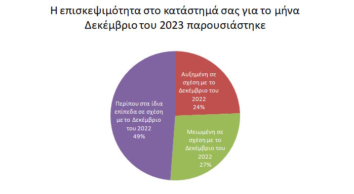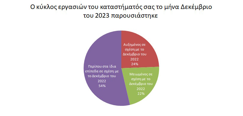 Στο ερώτημα για το πως παρουσιάστηκε ο κύκλος εργασιών των καταστημάτων για τον μήνα Δεκέμβριο του 2023 σε σχέση με τον Δεκέμβριο του 2022 το 24,4% (31,91% το 2022) των ερωτηθέντων υποστήριξε ότι είδε αύξηση του κύκλου εργασιών του, ενώ το 21,95% (19,15% το 2022) είδε μείωση. Το μεγαλύτερο ποσοστό των ερωτηθέντων 53,65% (48,94% το 2022) υποστηρίζει ότι ο κύκλος εργασιών του παρέμεινε περίπου ίδιος για τον Δεκέμβριο του 2022 σε σχέση με τον Δεκέμβριο του 2021.