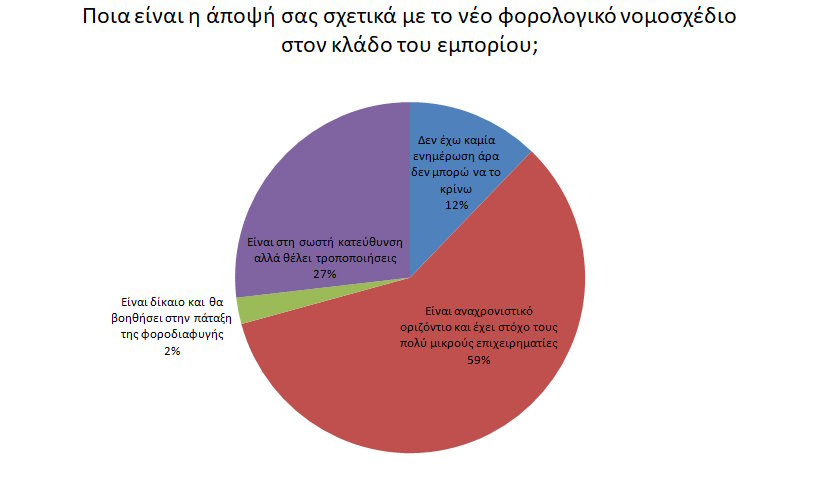 Στο επόμενο ερώτημα για το ποια είναι η άποψή των επαγγελματιών σχετικά με το νέο φορολογικό νομοσχέδιο στον κλάδο του εμπορίου το 58,53% θεωρεί ότι το νομοσχέδιο είναι αναχρονιστικό οριζόντιο και έχει στόχο τους πολύ μικρούς επιχειρηματίες. Το 26,82% απάντησε ότι είναι προς τη σωστή κατεύθυνση αλλά θέλει τροποποιήσεις ενώ το 2,43% θεωρεί ότι είναι δίκαιο και θα βοηθήσει στην πάταξη της φοροδιαφυγής. Τέλος το 12,19% απάντησε ότι δεν έχει καμία ενημέρωση άρα δεν μπορεί να το κρίνει.