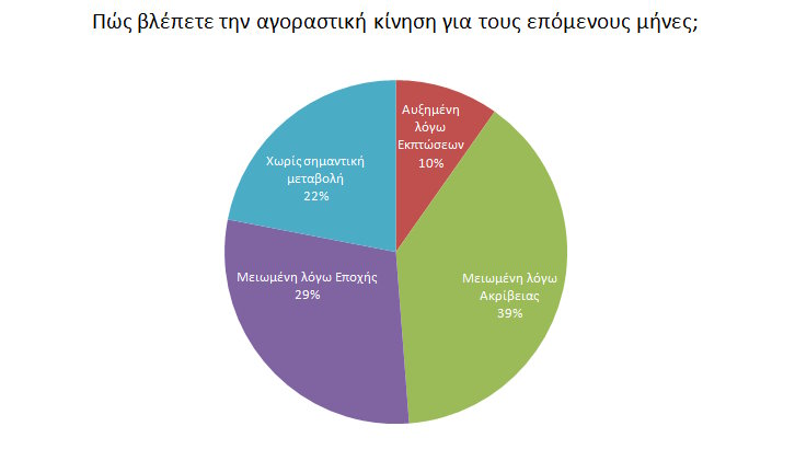 Στο ερώτημα πως βλέπουν οι επαγγελματίες την αγοραστική κίνηση για τους επόμενους μήνες, μόλις το 9,75% βλέπει αύξηση λόγω Εκπτώσεων, ενώ το 39,02% μείωση λόγω ακρίβειας. Το 29,26% θεωρεί ότι θα είναι μειωμένη λόγω εποχής και τέλος το 21,95 ότι δεν θα υπάρξει σημαντική μεταβολή.