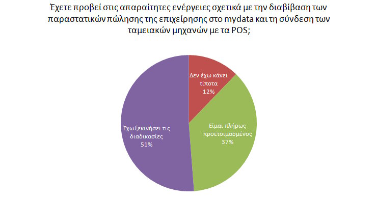 Στο ερώτημα αν έχετε προβεί στις απαραίτητες ενέργειες σχετικά με την διαβίβαση των παραστατικών πώλησης της επιχείρησης στο mydata και τη σύνδεση των ταμειακών μηχανών με τα POS, το 12,19% απάντησε ότι δεν έχει κάνει ακόμα καμία ενέργεια, το 36,58% ότι είναι πλήρως προετοιμασμένο και το 51,21% ότι έχει ξεκινήσει τις διαδικασίες.
