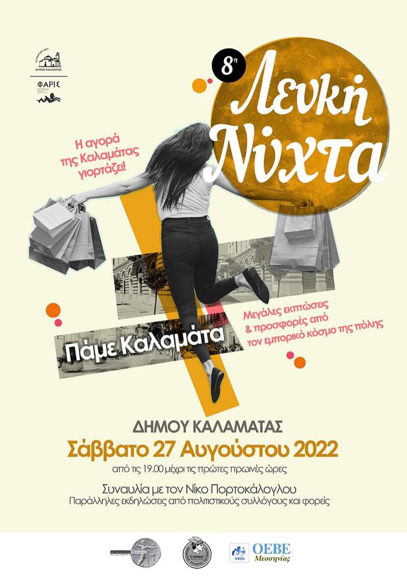 Ο Εμπορικός Σύλλογος Καλαμάτας «Ο Ερμής» υπό την αιγίδα του Δήμου Καλαμάτας και την υποστήριξη του Επιμελητηρίου Μεσσηνίας αναβιώνουν, μετά από δύο χρόνια υγειονομικών περιορισμών, την Λευκή Νύχτα!