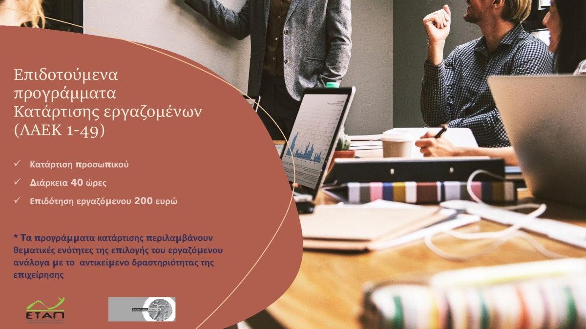 Ξεκινάει η υλοποίηση των σεμιναρίων του Επιδοτούμενου Προγράμματος Κατάρτισης Εργαζομένων ΛΑΕΚ του ΟΑΕΔ σε επιχειρήσεις που απασχολούν 1 - 49 άτομα με επιδότηση 200 ευρώ, σε συνεργασία με τον Εμπορικό Σύλλογο Καλαμάτας.